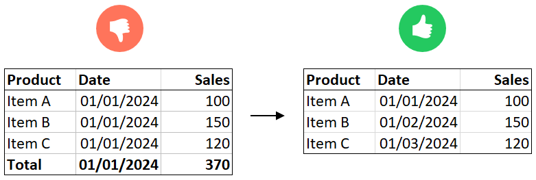 • Avoid storing dates horizontally (e.g., “Jan, Feb, Mar” in different columns) – keep them in a single column.