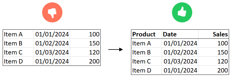 The optimal data structure for AI-driven analysis is a flat table where the first row contains descriptive column names (headers):