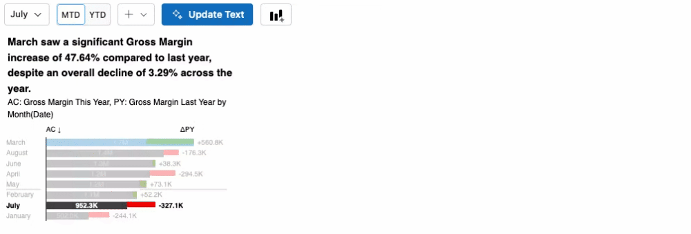 Need to refine a visual? Open the hover-menu “Data Config” to swap fields, add comparisons, or adjust aggregations on the fly. Whether correcting a mislabeled series or introducing new dimensions, you can tailor each visual instantly—no reloading or coding required.