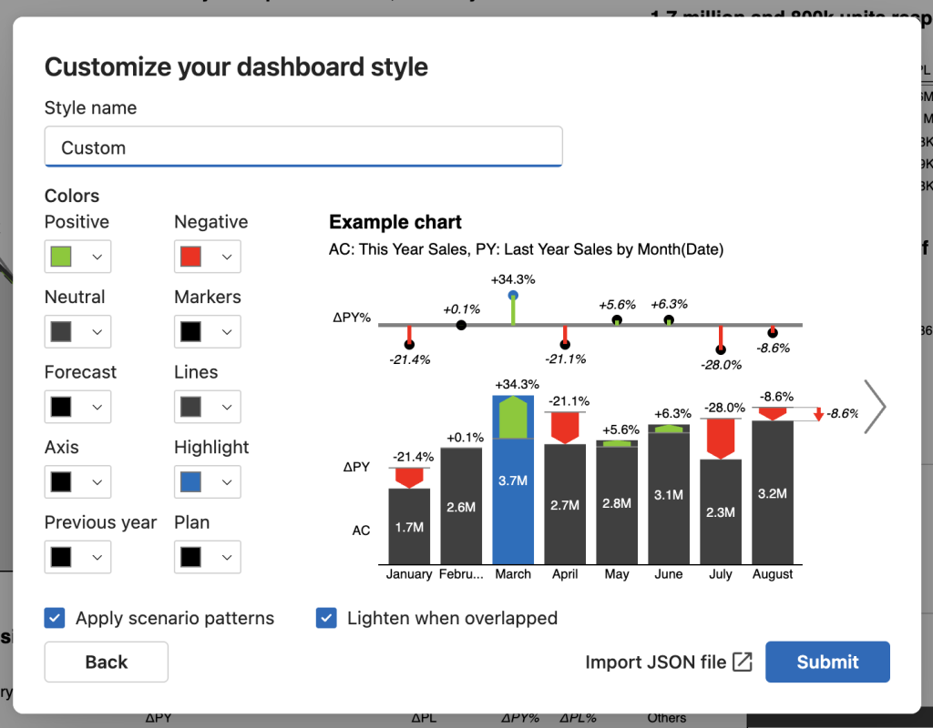 Align every dashboard with your brand guidelines through the sidebar styling menu. Adjust color palettes, fonts, chart elements, and more, or import your existing Zebra BI JSON themes from Power BI or Office. This flexibility ensures your visuals maintain a professional, on-brand look across all reports.